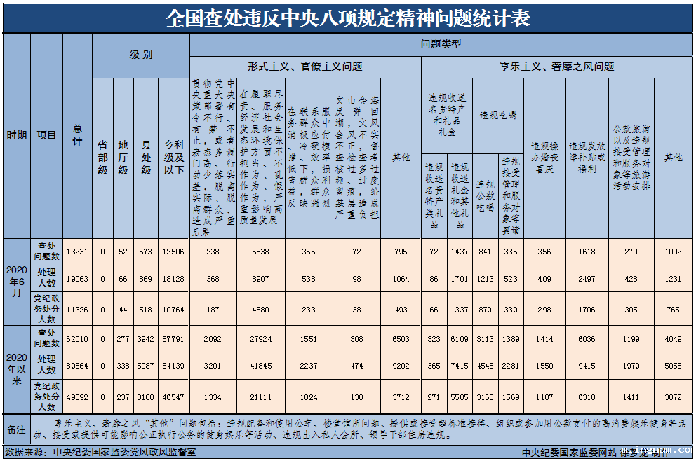 7月29日,中央纪委国家监委公布了2020年6月全国查处违反中央八项规定精神问题统计表。至此,2020年上半年月报数据均已发布。数据显示,上半年共查处违反中央八项规定精神问题62010个,处理89564人,给予党纪政务处分49892人。